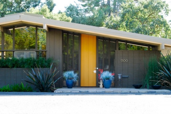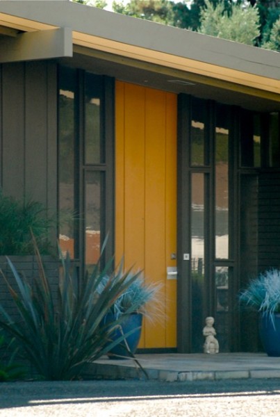 "The Frame home, built around 1957 for a close friend of the architect (Dr. Warren Frame delivered Sparks' daughter, and the Sparks family spent many holidays at the Frame's home), announces its theme, as so many Sparks houses do, at the front door, which rises to meet the sloping roof and slopes along with it.