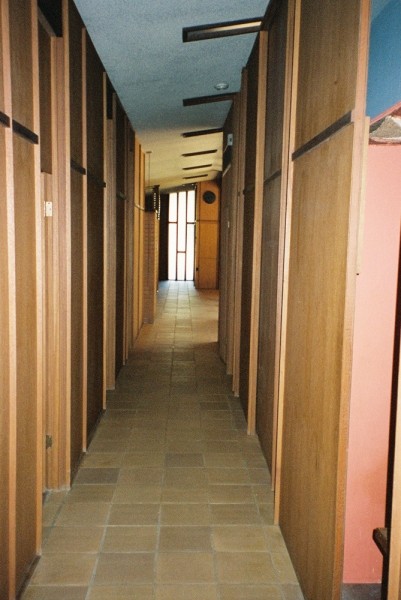 The story goes that the curved partition at the entyway was created by Sparks to accomodate the Frames' previous sofa, which was curved. Details also show pullchains that run floor to ceiling which acted as light switches. An accordian room divider originally seperated the dining from living room, providing extra intimacy at the dining table. Most of the day to day meals however, were eaten at the drop down table. Also note the light fixtures (not designed by Sparks), and built in telephone nook.