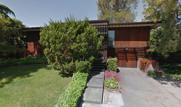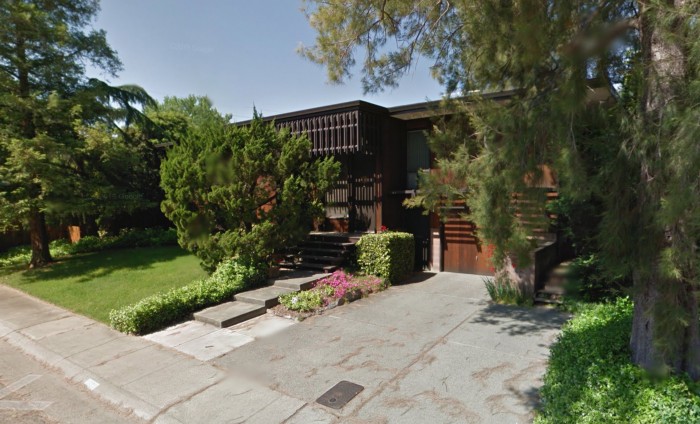 Zann has had her eye on this one for a while. It's got many tell-tale Sparks features including decorative wooden screens, staggered concrete pads and steps, oversized tall entry door, large block work, exposed redwood paneling and a slightly idiosyncratic design. It's boxy nature however, evokes the work of John Harvey Carter....