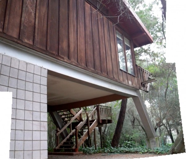 This small 875 square foot dwelling is perched 10 - 15 ft above the ground on a square patterned masonry block plinth, and 3 massive angled steel beams. Most of wall space is windows. The elevated platform allows for a view in the oak trees surrounding the site while ensuring privacy within.