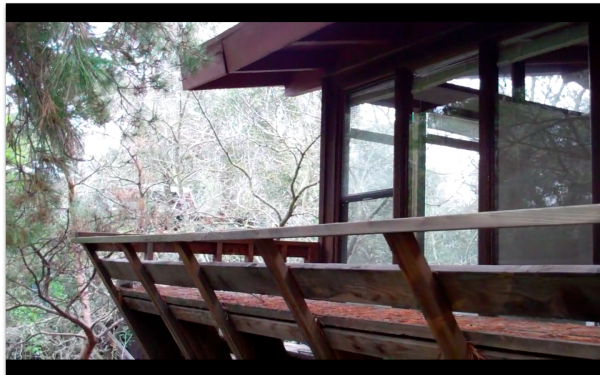 This small 875 square foot dwelling is perched 10 - 15 ft above the ground on a square patterned masonry block plinth, and 3 massive angled steel beams. Most of wall space is windows. The elevated platform allows for a view in the oak trees surrounding the site while ensuring privacy within.