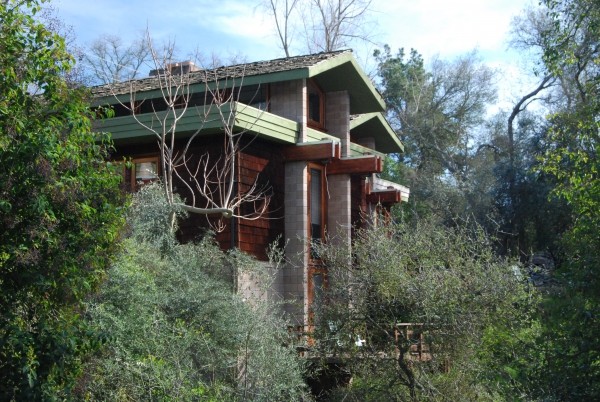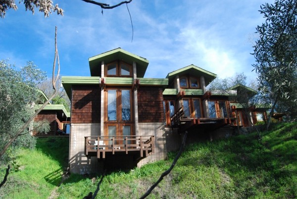 This custom home features a pseudo subterranean entrance, where one travels into the side of a hill which is surrounded with brick, then to the front door. One can imagine once at the front door, you can see straight through the house to the creek lined canyon beyond. There are numerous alcoves beyond each room built into the cliff-side with views to the sky above, but complete privacy.